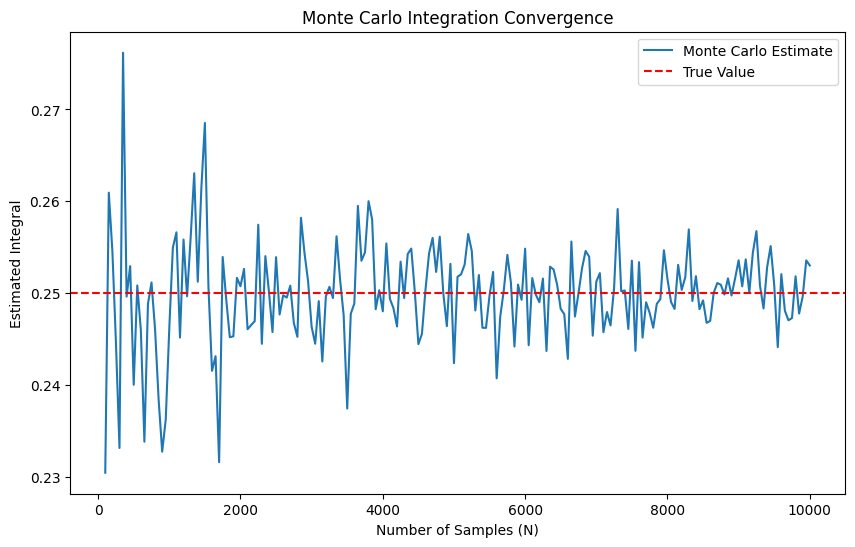 Monte Carlo method generates an answer that is close to the analytical solution, which is \(0.25\), but not exact. The accuracy of the Monte Carlo estimate improves with more samples.