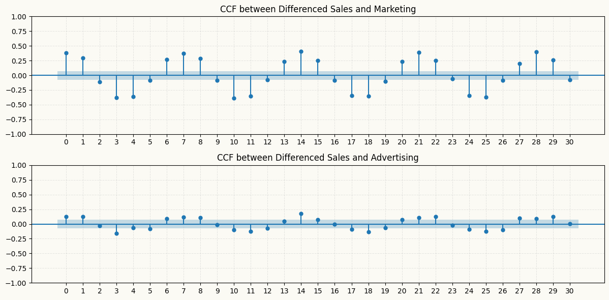 # also let's check the cross-correlation between the differenced sales and marketing series to see if there is any lagged relationship between them that we can capture with our models. We can use the `plot_ccf` function from `peshbeen.statsplots` to visualize the cross-correlation function (CCF) between the two series.from statsmodels.graphics.tsaplots import plot_ccf# from matplotlib.ticker import MaxNLocatordiff_sales = multivariate_data['sales'].diff().dropna()diff_marketing = multivariate_data['marketing'].diff().dropna()diff_advertising = multivariate_data['advertising'].diff().dropna()_, ax = plt.subplots(2, 1, figsize=(12, 6))plot_ccf(diff_sales, diff_marketing, lags=30, ax=ax[0])plot_ccf(diff_sales, diff_advertising, lags=30, ax=ax[1])ax[0].set_title('CCF between Differenced Sales and Marketing')ax[1].set_title('CCF between Differenced Sales and Advertising')for a in ax: a.grid(True, alpha=0.3, linestyle='--', linewidth=0.7) a.set_xticks(np.arange(0, 31, 1))plt.tight_layout()plt.show()