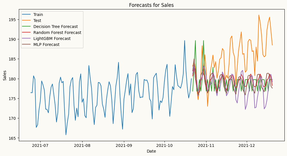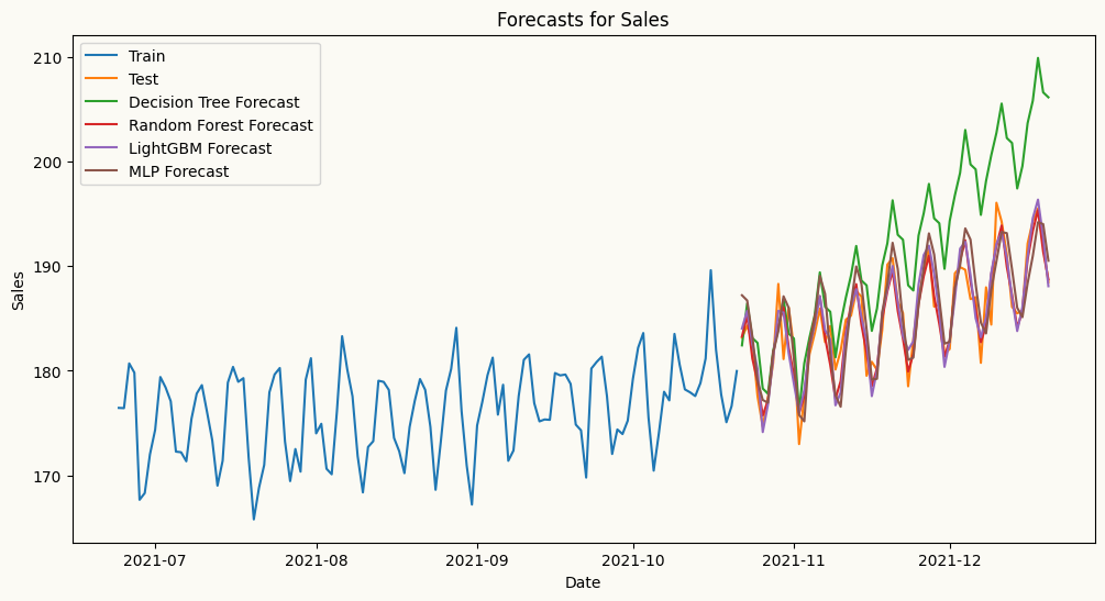 ## plot the forecasts and the actual values for salesplt.figure(figsize=(12, 6))plt.plot(mv_train_data.index[-120:], mv_train_data['sales'][-120:], label='Train')plt.plot(mv_test_data.index, mv_test_data['sales'], label='Test')plt.plot(mv_test_data.index, dt_forecasts['sales'], label='Decision Tree Forecast')plt.plot(mv_test_data.index, rf_forecasts['sales'], label='Random Forest Forecast')plt.plot(mv_test_data.index, lgbm_forecasts['sales'], label='LightGBM Forecast')plt.plot(mv_test_data.index, mlp_forecasts['sales'], label='MLP Forecast')plt.title('Forecasts for Sales')plt.xlabel('Date')plt.ylabel('Sales')plt.legend()plt.show()
