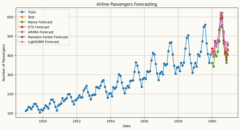 Machine Learning Regressors (multivariate) — any scikit-learn-compatible regressor, from LinearRegression and RandomForest to XGBoost, LightGBM, and CatBoost.