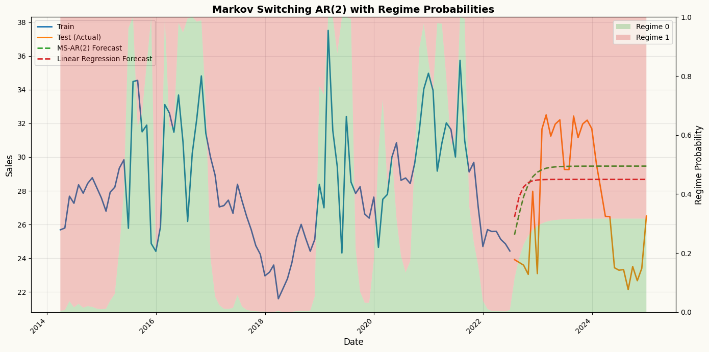 ## Create a sales series with regime switchesimport numpy as npimport pandas as pdnp.random.seed(42)n =300dates = pd.date_range(start="2000-01-01", periods=n, freq="ME")# Define hidden regimes (Regime 0 is "Stable", Regime 1 is "High")regime_switches = np.zeros(n)for i inrange(1, n):# Create persistent regimes (90% chance to stay in current state)if regime_switches[i-1] ==0: regime_switches[i] = np.random.choice([0, 1], p=[0.9, 0.1])else: regime_switches[i] = np.random.choice([0, 1], p=[0.2, 0.8])series = np.zeros(n)# Generate data with AR(1) logic based on the current regimefor t inrange(1, n):if regime_switches[t] ==0:# Regime 0: Low mean, high lag dependency series[t] =5+0.8* series[t-1] + np.random.normal(0, 1)else:# Regime 1: High mean, low lag dependency series[t] =25+0.2* series[t-1] + np.random.normal(0, 3)ms_data = pd.DataFrame({"sales": series}, index=dates)train_ms = ms_data.iloc[:-30]test_ms = ms_data.iloc[-30:]from peshbeen.models import ms_arrms_arr_model = ms_arr(target_col="sales", n_components=2, lags=2, add_constant=True, n_iter=50, tol=1e-4, random_state=42)ms_arr_model.fit(train_ms)ms_arr_forecast = ms_arr_model.forecast(H=30)regime_probs = ms_arr_model.predict_proba()## also create linear regression forecasts for comparisonfrom sklearn.linear_model import LinearRegressionlr_model = ml_forecaster(target_col="sales", model=LinearRegression(), lags=2)lr_model.fit(train_ms)lr_forecast = lr_model.forecast(H=30)import matplotlib.pyplot as pltfig, ax1 = plt.subplots(figsize=(14, 7))# Get regime probabilitiesregime_probs_train = ms_arr_model.predict_proba()regime_probs_forecast = ms_arr_model.forecast_forward # call for regime probabilities during forecast horizon# No lag offset needed - already aligned with full training data!n_train_tail =100# Get tail of training data and regime probstrain_dates_tail = train_ms.index[-n_train_tail:]train_sales_tail = train_ms["sales"].values[-n_train_tail:]regime_probs_tail = [regime_probs_train[0][-n_train_tail:], regime_probs_train[1][-n_train_tail:]]# Combine with forecastdates_full =list(train_dates_tail) +list(test_ms.index)regime_probs_full = [np.concatenate([regime_probs_tail[0], regime_probs_forecast[0]]), np.concatenate([regime_probs_tail[1], regime_probs_forecast[1]])]# Plot the time series on primary axisax1.plot(train_dates_tail, train_sales_tail, label="Train", color="C0", linewidth=2)ax1.plot(test_ms.index, test_ms["sales"], label="Test (Actual)", color="C1", linewidth=2)ax1.plot(test_ms.index, ms_arr_forecast, label="MS-AR(2) Forecast", color="C2", linestyle='--', linewidth=2)ax1.plot(test_ms.index, lr_forecast, label="Linear Regression Forecast", color="C3", linestyle='--', linewidth=2)ax1.set_ylabel("Sales", fontsize=12)ax1.set_xlabel("Date", fontsize=12)ax1.legend(loc="upper left", fontsize=10)ax1.grid(True, alpha=0.3)# Overlay regime probabilities as stacked areaax2 = ax1.twinx()ax2.stackplot(dates_full, regime_probs_full[0], regime_probs_full[1], labels=['Regime 0', 'Regime 1'], alpha=0.25, colors=['C2', 'C3'])ax2.set_ylabel("Regime Probability", fontsize=12)ax2.set_ylim(0, 1)ax2.legend(loc="upper right", fontsize=10)plt.title("Markov Switching AR(2) with Regime Probabilities", fontsize=14, fontweight='bold')plt.setp(ax1.get_xticklabels(), rotation=45, ha="right")plt.tight_layout()plt.show()