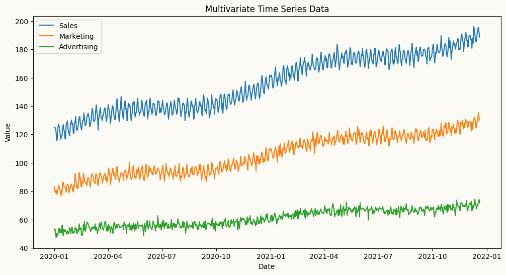 import numpy as npimport pandas as pdimport matplotlib.pyplot as plt## Create a multivariate autoregressive sales data with 3 features: sales, marketing spend, and advertising spend to show if we can capture the relationships between past values of all three features to forecast the future values of sales. date_range = pd.date_range(start='2020-01-01', periods=720, freq='D')np.random.seed(42)doy = date_range.dayofyear.to_numpy() # force NumPy, not pandas Indexdata1 =120+0.1* np.arange(720) +5* np.sin(2* np.pi * doy /7) +6* np.sin(2* np.pi * doy /365) + np.random.normal(0, 2, 720)data2 =80+0.07* np.arange(720) +3* np.sin(2* np.pi * doy /7) +4* np.sin(2* np.pi * doy /365) + np.random.normal(0, 2, 720)data3 =50+0.03* np.arange(720) +1* np.sin(2* np.pi * doy /7) +2* np.sin(2* np.pi * doy /365) + np.random.normal(0, 2, 720)# create a multivariate datasetmultivariate_data = pd.DataFrame({'sales': data1, 'marketing': data2, 'advertising': data3}, index=date_range)## add the day of week and month as categorical variables to the multivariate datasetmultivariate_data["day_of_week"] = multivariate_data.index.dayofweekmultivariate_data["month"] = multivariate_data.index.month# plot the multivariate dataplt.figure(figsize=(12, 6))plt.plot(multivariate_data.index, multivariate_data['sales'], label='Sales')plt.plot(multivariate_data.index, multivariate_data['marketing'], label='Marketing')plt.plot(multivariate_data.index, multivariate_data['advertising'], label='Advertising')plt.title('Multivariate Time Series Data')plt.xlabel('Date')plt.ylabel('Value')plt.legend()plt.show()