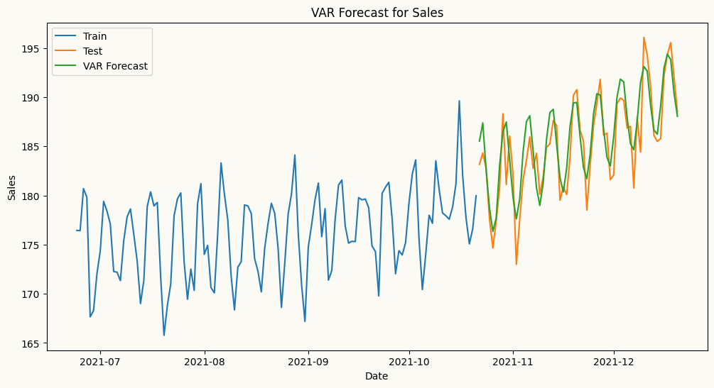 # plot the forecasts and the actual values for salesplt.figure(figsize=(12, 6))plt.plot(mv_train_data.index[-120:], mv_train_data['sales'][-120:], label='Train')plt.plot(mv_test_data.index, mv_test_data['sales'], label='Test')plt.plot(mv_test_data.index, var_forecasts['sales'], label='VAR Forecast')plt.title('VAR Forecast for Sales')plt.xlabel('Date')plt.ylabel('Sales')plt.legend()plt.show()
