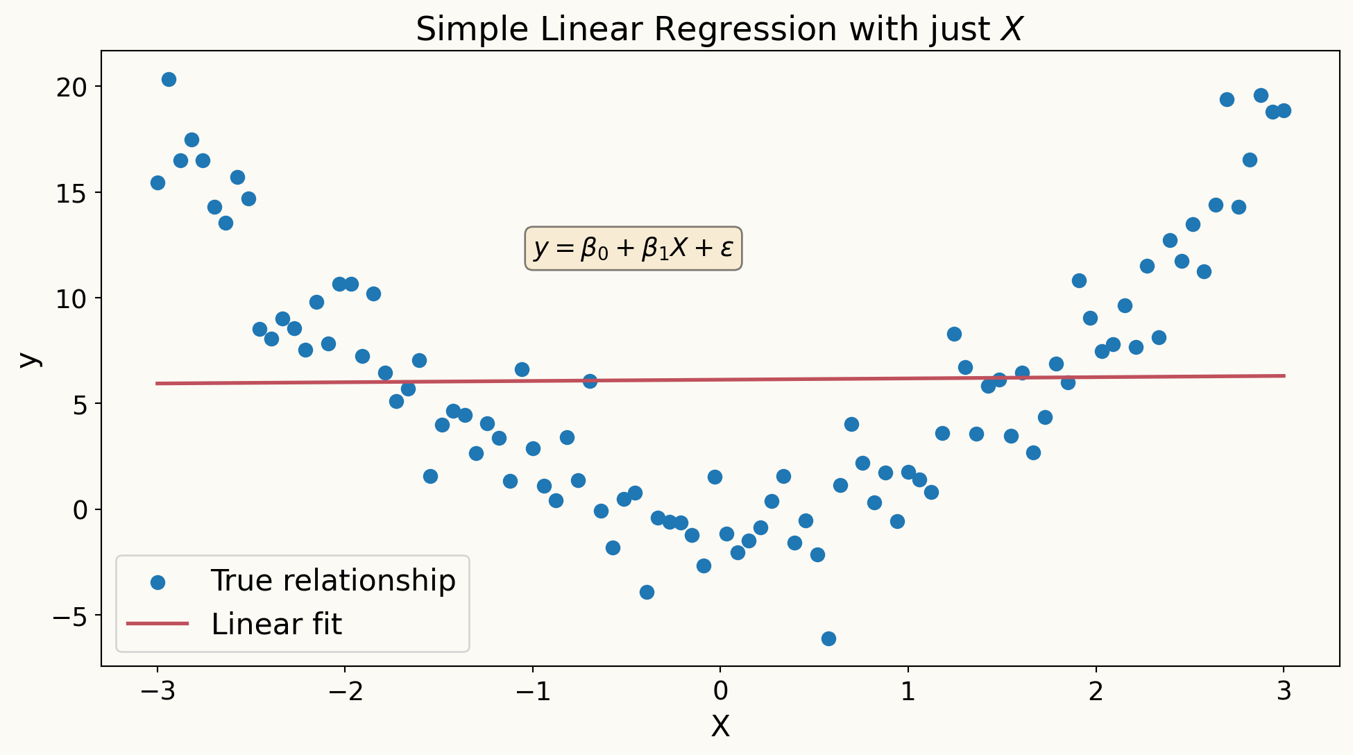 \[ Y_i = \alpha + \beta T_i + \gamma X_i + \varepsilon_i \]