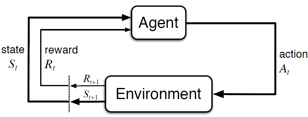 The \(p(s', \mid s, a)\) defines the dynamics of the MDP and \(p\) specifies a probability distribution for each choice of \(s\) and \(a\): \[ \sum_{s'\in S}p(s' \mid s, a) = 1, \text{ for all } s \in S, a \in A(s) \]
